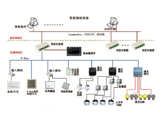 智能照明的控制終端由控制面板、控制器等單元構(gòu)成。主控制器和照明終端和智能化電器終端之間通過(guò)信息接口等元件來(lái)連接,實(shí)現(xiàn)控制信息的傳輸。發(fā)電廠總線式智能照明節(jié)能控制系統(tǒng)由一次回路智能型照明控制箱、二次自動(dòng)化控制通訊管理機(jī)和后臺(tái)、以及通訊網(wǎng)絡(luò)等組成部分構(gòu)架而成。