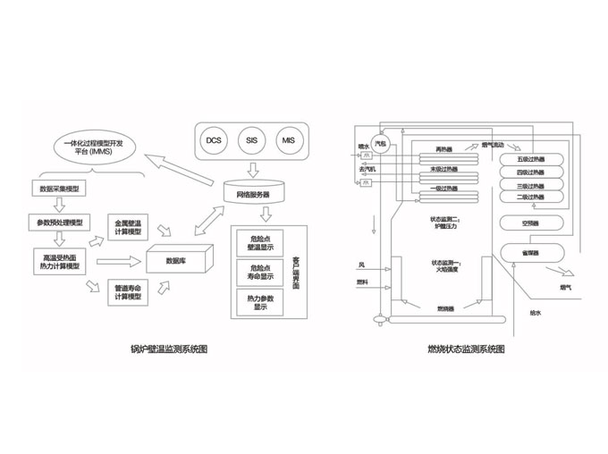 電站鍋爐高溫壁溫監(jiān)測(cè)系統(tǒng)是在電站原有的集散控制系統(tǒng)(DCS)、廠級(jí)監(jiān)控信息系統(tǒng)(SIS) 和廠級(jí)管理信息系統(tǒng)( MIS )的數(shù)據(jù)的基礎(chǔ)上,借助于-體化過(guò)程模型開(kāi)發(fā)平臺(tái)(IMMS) ,建立高溫受熱面的數(shù)學(xué)模型以及金屬壁溫和管道壽命的計(jì)算模型